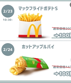 こんばんは〜あまねです🌙 皆さん23日からマクドナルドで100円祭りをしているのをご存知ですか❔ あまねはポテトもアップルパイも大好きなので、もう大歓喜❣️❣️ まんまと罠にはまって毎日マックに通っています🍟 100円お得すぎるし、モバイルオーダーしておけば待ち時間短縮なるからおすすめ🕐 なんかマックの回し者みたいになってるけど、100円クーポンで皆幸せになろう🌼 ゲットした報告も待ってるよ〜🍦(?) 画像はお借りしたものだけど貼っとく